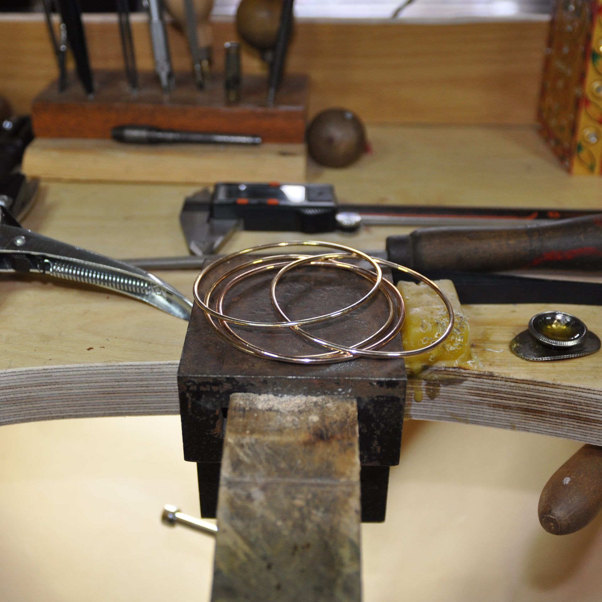 A small range of solid gold bangles, handmade using pre-owned gold brought locally.