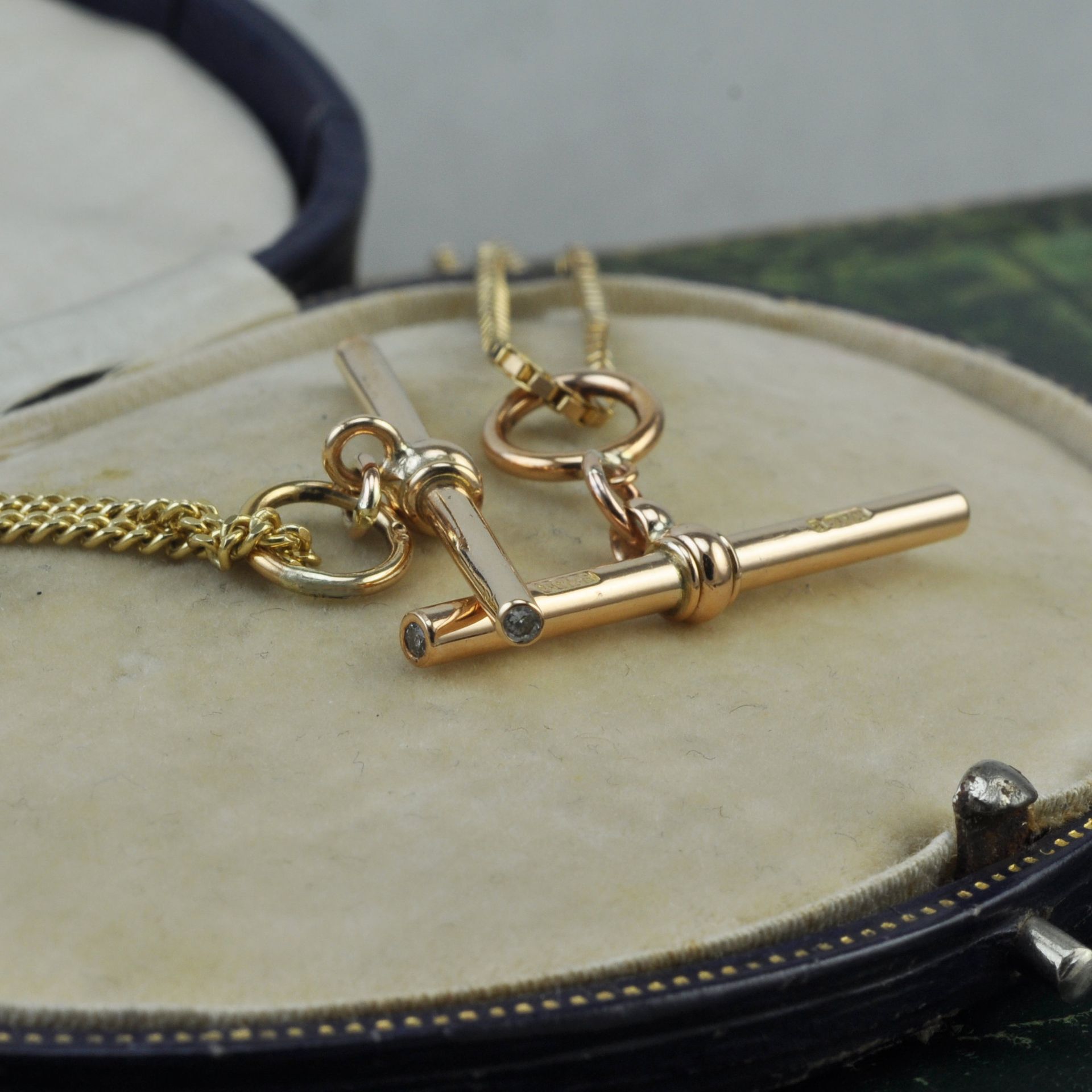 Two of our diamond set T-bars in gold. These are antique 9ct rose gold T-bars taken from old watch chains and made up as pendants using old traditional fittings. The swivels allow for pairing with larger chains or clipping on to individual links.